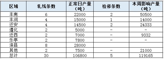 中商網訊:本周唐山18家232系列帶鋼廠30條帶鋼生產線中,5條帶鋼線檢修或停產,影響產量11.92萬噸,產能利用率為84.7%,較上周降低5.37%,25條帶鋼線開工生產,開工率83.33%,較上周降低6.67%。