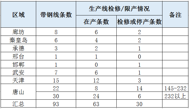 中商網(wǎng)訊:本周京津冀32家長(zhǎng)流程帶鋼廠60條帶鋼生產(chǎn)線(xiàn)中,10條檢修或停產(chǎn),影響產(chǎn)量28.25萬(wàn)噸,產(chǎn)能利用率為80.39%較上周下降4.84%。28家短流程帶鋼廠33條帶鋼線(xiàn)中,15條檢修或停產(chǎn),影響產(chǎn)量30.56萬(wàn)噸,產(chǎn)能利用率39.62%較上周下降8.24%。
