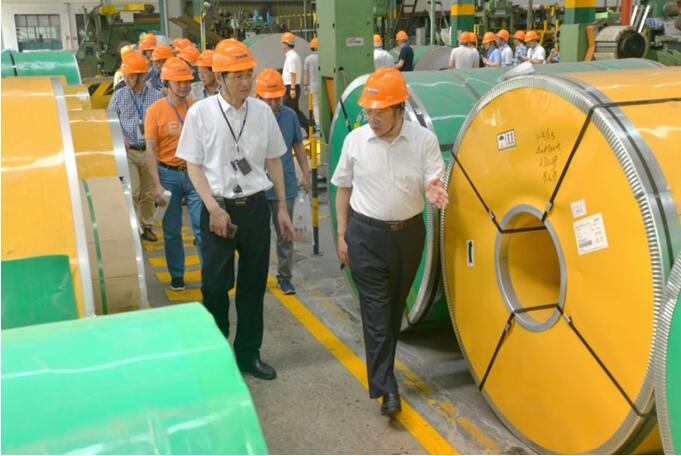 圖一、康力電梯董事長(zhǎng)王友林(前二)與大明國(guó)際總裁蔣長(zhǎng)虹(前一),在參觀不銹鋼加工中心。(楊木軍攝)