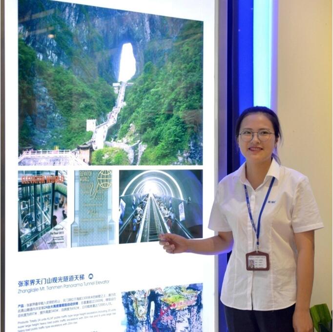 圖二、康力電梯展館員工在解說(shuō)天門山觀光隧道扶梯。楊木軍攝