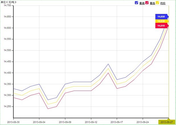 自本周起,電解鋁現(xiàn)貨受庫(kù)存量不斷縮減和下游采購(gòu)企業(yè)節(jié)前備貨的影響,現(xiàn)貨電解鋁價(jià)格反彈270元/噸,截止周五(2013.9.27)長(zhǎng)江現(xiàn)貨電解鋁價(jià)格14610-14650元/噸,均價(jià)14630元/噸。