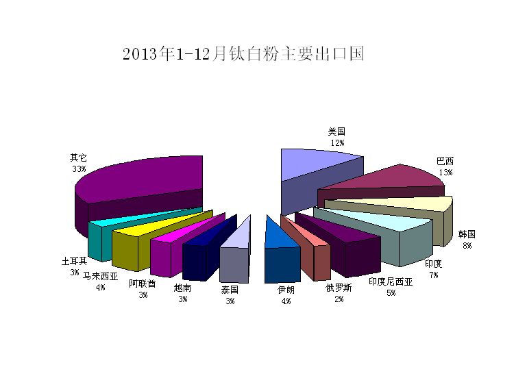 從出口國別來看,主要出口目的地為美國、巴西、韓國、印度、印尼、伊朗、泰國、俄羅斯、馬來西亞等,占比分別為13%、12%、8%、7%、5%、4%、3%、2%、4%,這幾個國家基本都是金磚國家、經濟發達區域以及人口面積大國,經濟增長和消費潛力空間均較大。美國為國內鈦白粉出口第一大國家,但由于國內鈦白粉質量還無法匹敵杜邦等巨頭的產品,因此國內鈦白粉在美國市場主要用于相對低端的領域,主要靠價格優勢競爭。隨著我國環評力度的增大以及對高端市場的搶占,國內鈦白粉企業的整合勢在必行。目前國產鈦白粉還是以國內消化為主,由于這兩年經濟發展速度放緩,鈦白粉需求也隨之大幅減少,往年常見的消費旺季也沒能拉動消費,致使現貨市場庫存量大,龍頭企業一再降價,但仍是回天無術。曾經有媒體預測,我國鈦白粉出口價格會在8月份以后緩慢回升,但這一拐點遲遲沒有到。而這一態勢很有可能在2014年持續。