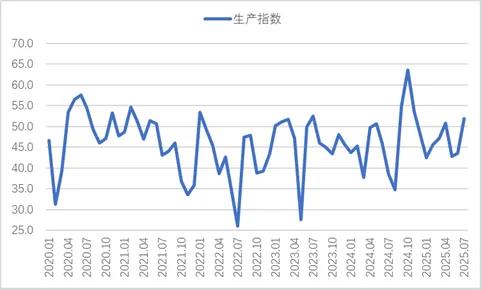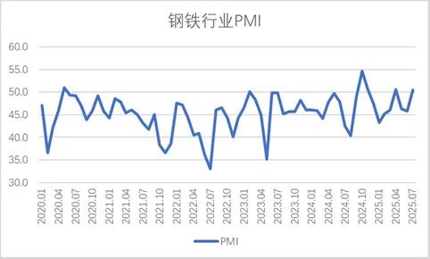 從中物聯(lián)鋼鐵物流專業(yè)委員會調(diào)查、發(fā)布的鋼鐵行業(yè)PMI來看,2025年7月份為50.5%,環(huán)比上升4.6個百分點,結(jié)束連續(xù)2個月環(huán)比下降態(tài)勢,重回擴張區(qū)間。分項指數(shù)變化顯示,受政策端帶動,鋼鐵需求和生產(chǎn)均有所回暖,鋼材和原材料價格明顯反彈,鋼廠對后市預(yù)期較為樂觀。預(yù)計8月份,鋼鐵需求端或繼續(xù)弱勢復(fù)蘇,鋼廠生產(chǎn)小幅上升,煉鋼原材料價格與鋼材價格震蕩運行。