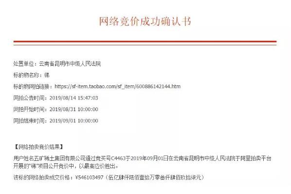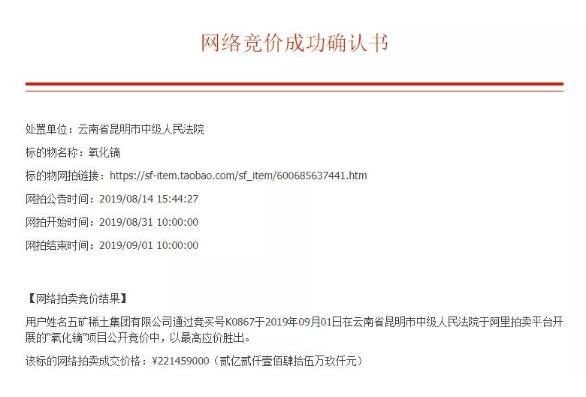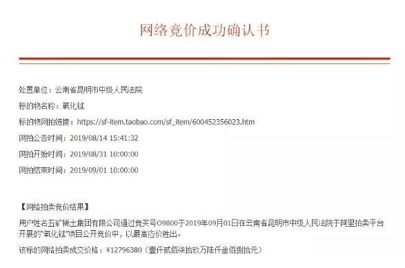 上周六上午10點,泛亞被法拍的全部、氧化鏑、氧化鋱均被五礦稀土集團有限公司拍得!