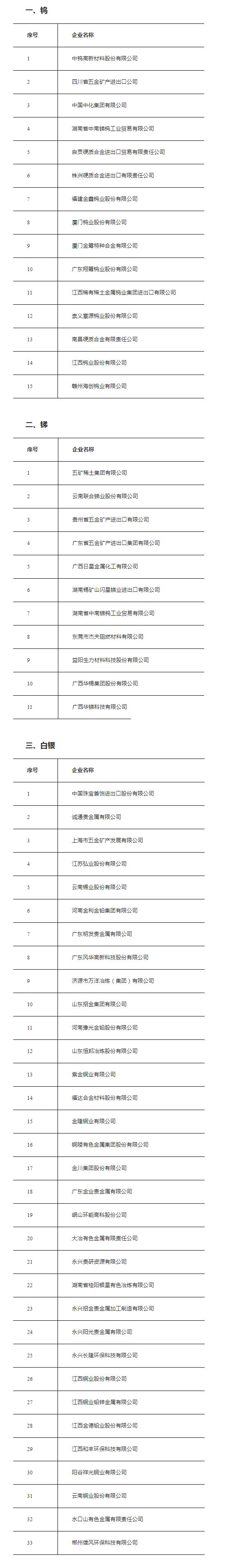 在申報期限內,共有17家企業遞交了鎢出口國營貿易資質申請材料,其中15家為已獲得資質的企業且符合公告要求,1家暫不符合;1家新申報企業材料齊全且符合公告要求。共有12家企業遞交了銻出口國營貿易資質申請材料,其中10家為已獲得資質的企業且符合公告要求;1家新申報企業材料齊全且符合公告要求,1家暫不符合公告要求。共有41家企業遞交了白銀出口國營貿易資質申請材料,其中15家為已獲得資質的企業且符合公告要求,1家暫不符合公告要求;25家新申報企業,18家生產企業材料齊全且符合公告要求,4家生產企業和3家流通企業暫不符合公告要求。