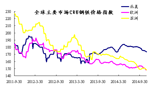 上周國際鋼市持續整體下滑,CRU國際鋼價綜合指數為1543.84,CRU扁平材指數為148.48,CRU長材指數為166.33,北美市場CRU價格指數為173.69,歐洲市場CRU價格指數為148.33,亞洲市場CRU價格指數為148.2。