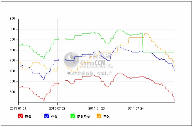 2014年美國薄板市場的走勢可以用先揚后抑來形容。上半年板材價格低位回升的走勢得益于美國鋼廠連續提價,增強了商家信心。同時,市場需求尚可,且庫存壓力不大。這些利好因素成就了美國薄板價格的上漲。但是下半年以來,薄板價格高位回落。特別是受美元強勁走勢,以及大宗商品價格不斷跳水影響,美國薄板價格開始下跌。另外,隨著訂單減少,庫存不斷攀升,以及低價進口資源的多重壓力,美國薄板價格開啟了小幅下滑之路。